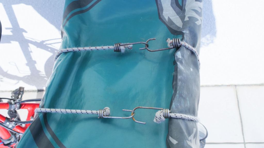 • Le croisement de 4 tendeurs est absolument nécessaire pour maintenir le bidon en place. Les 2 tendeurs bleus passent sous le bidon, dans la longueur et traversent le porte bagage. Ils sont sous le couvercle, dans les entailles, et donc invisibles une fois en place. Les 2 tendeurs blancs, dans la largeur viennent faire un tour complet autour du bidon, l’un à gauche, l’autre à droite, en passant sous le porte bagage pour fixer le bidon à celui-ci.