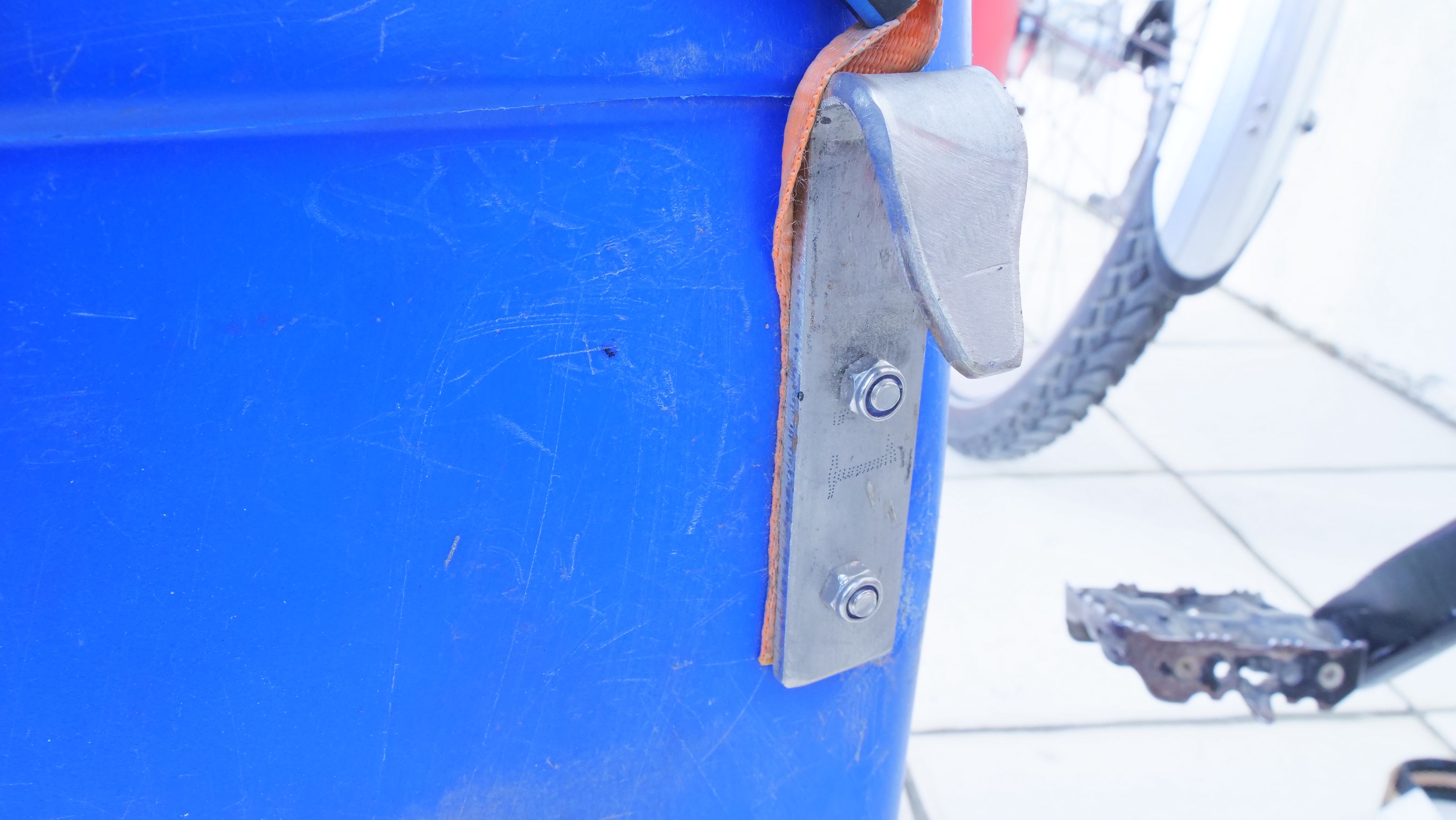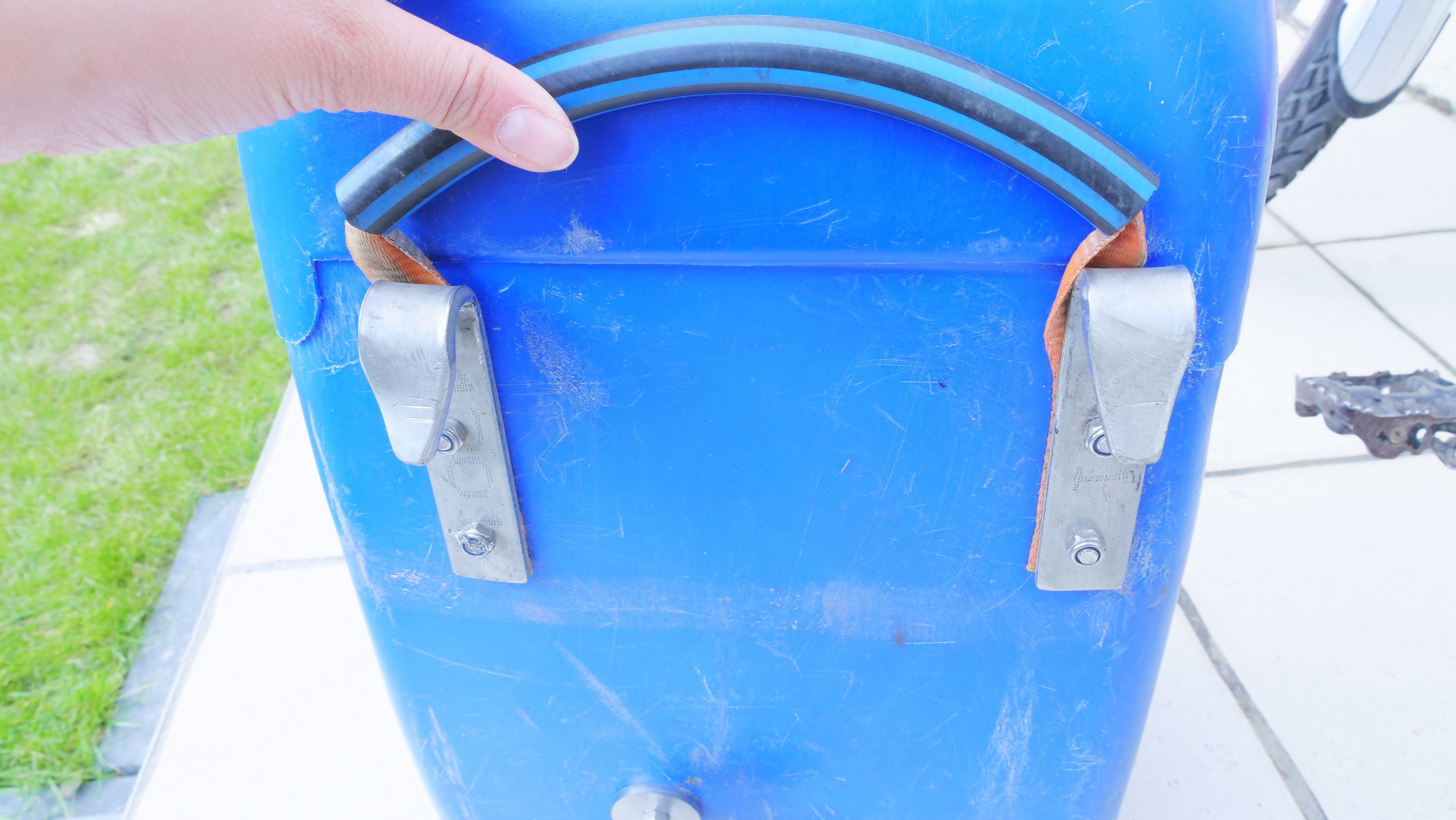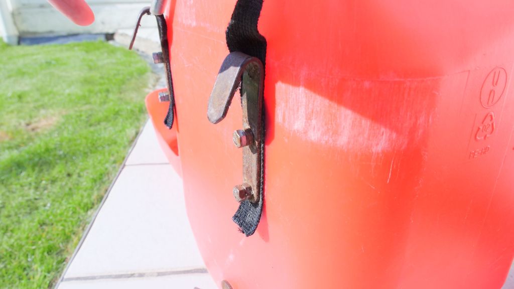 • Pour la poignée, il s’agit d’une sangle simple, passée dans un morceau de tuyau, la sangle est « vissée » et surtout coincée entre le bidon et les crochets.