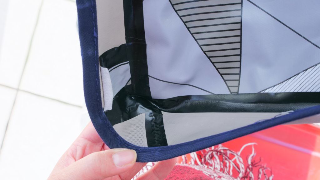 • La couture du couvercle est simple. Deux languettes de tissus se superposent dans chaque angle et une double couture, parallèle, va venir les souder. Coller les languettes avant de les coudre (ou en même temps) et coller également les fils et coutures afin de garantir l’étanchéité.